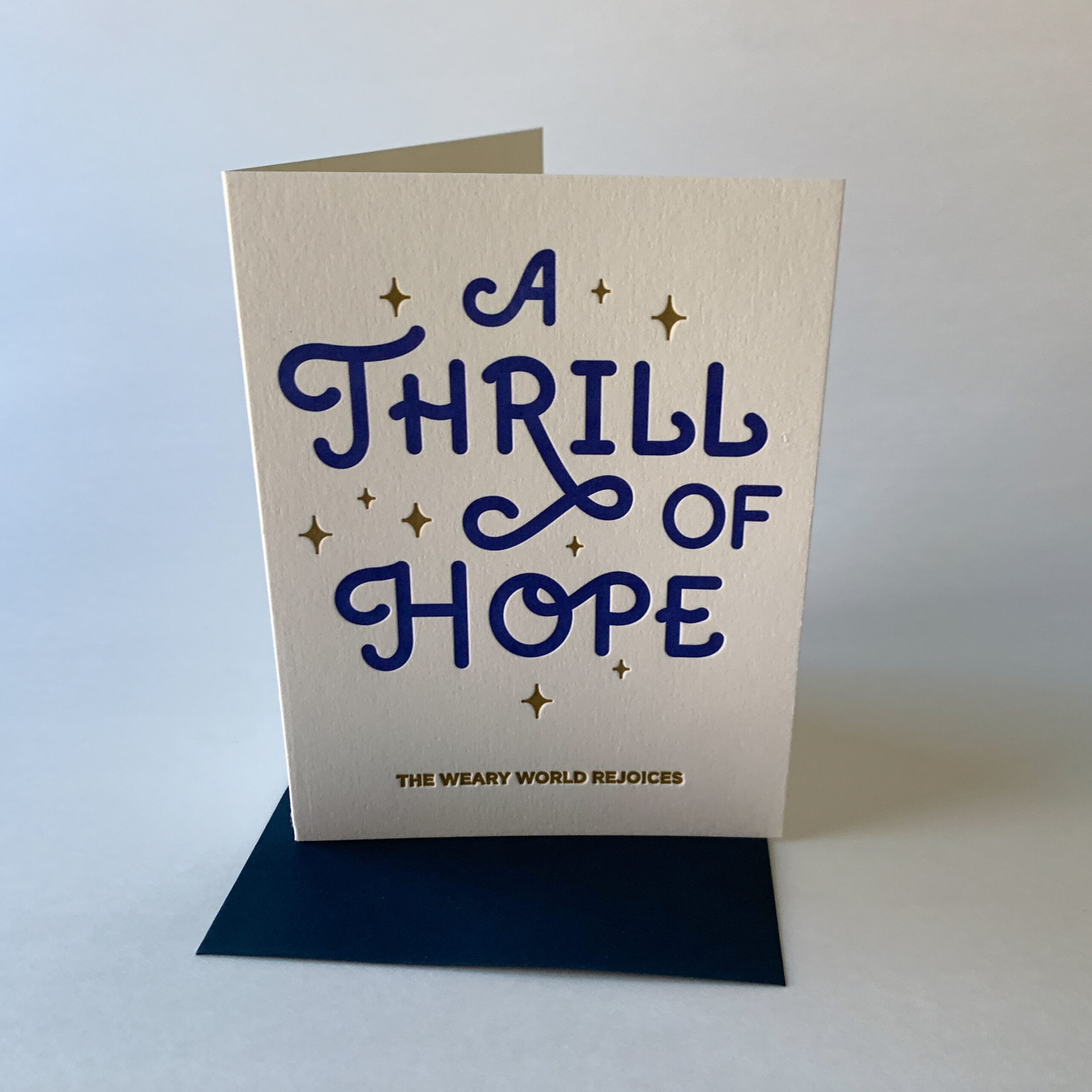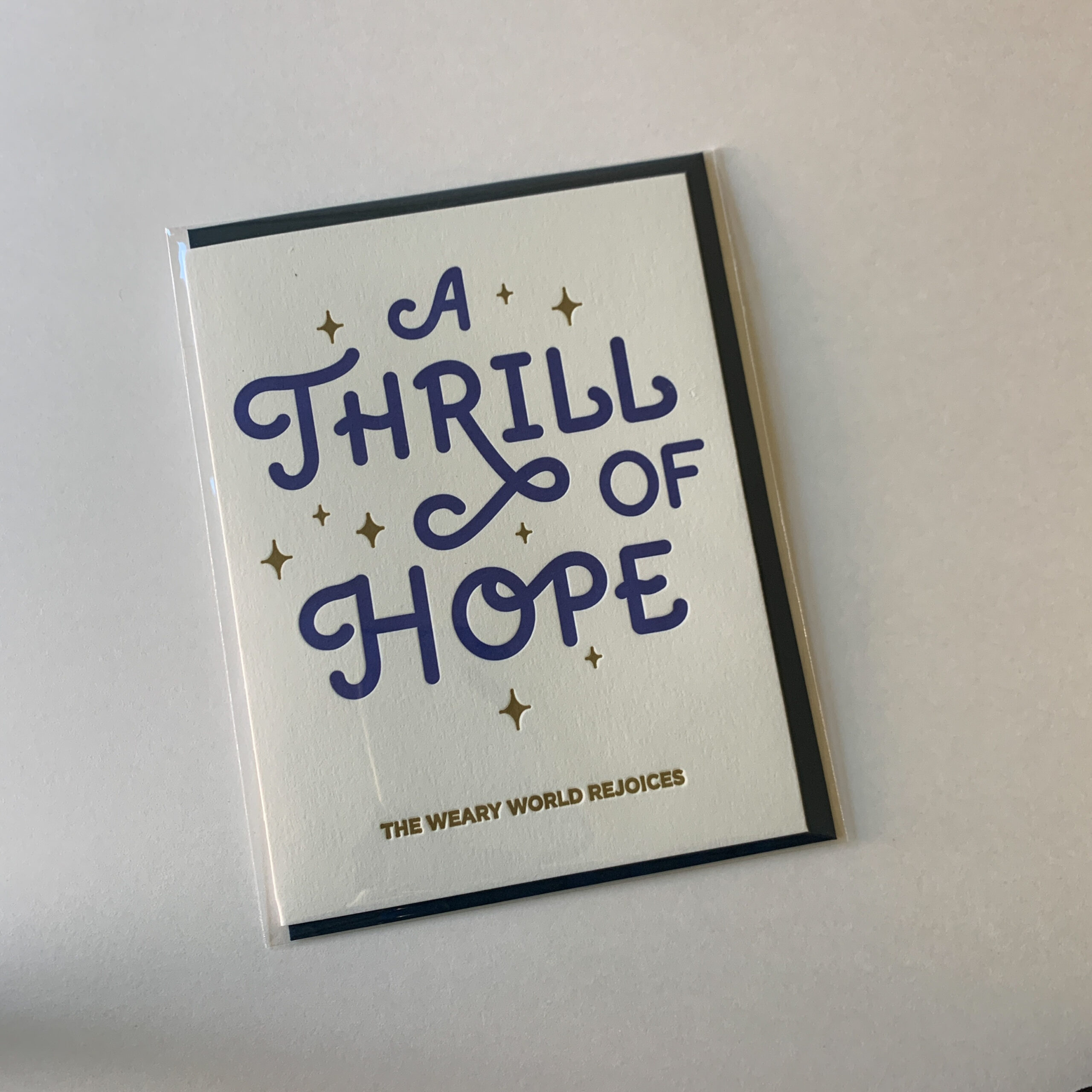 A Christmas card designed with lyrics from “O Holy Night”. This A2 (4.25″x5.5″) card features hand lettering printed on a historic 1948 Chandler and Price letterpress. Blank inside for your personal message, and comes with an envelope.