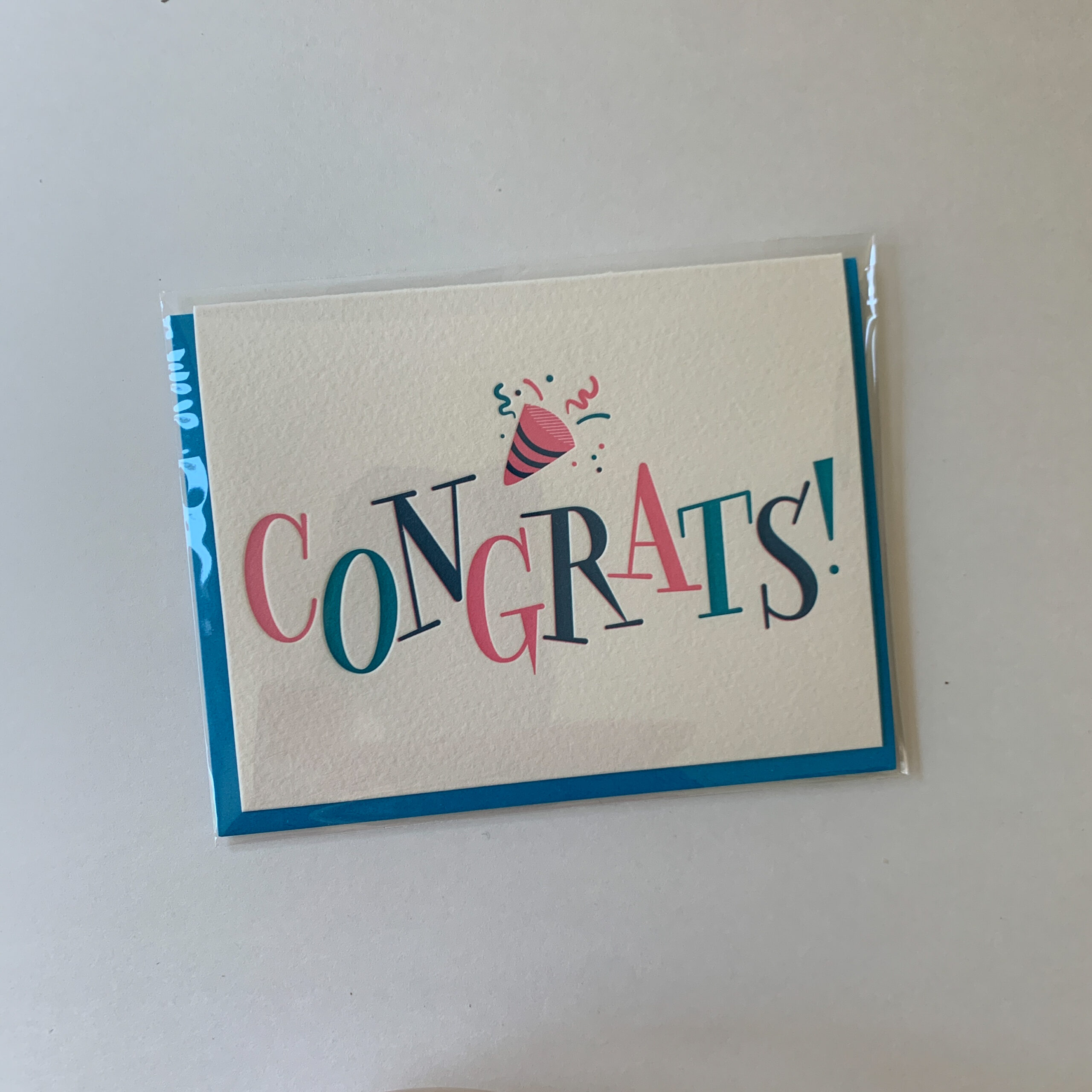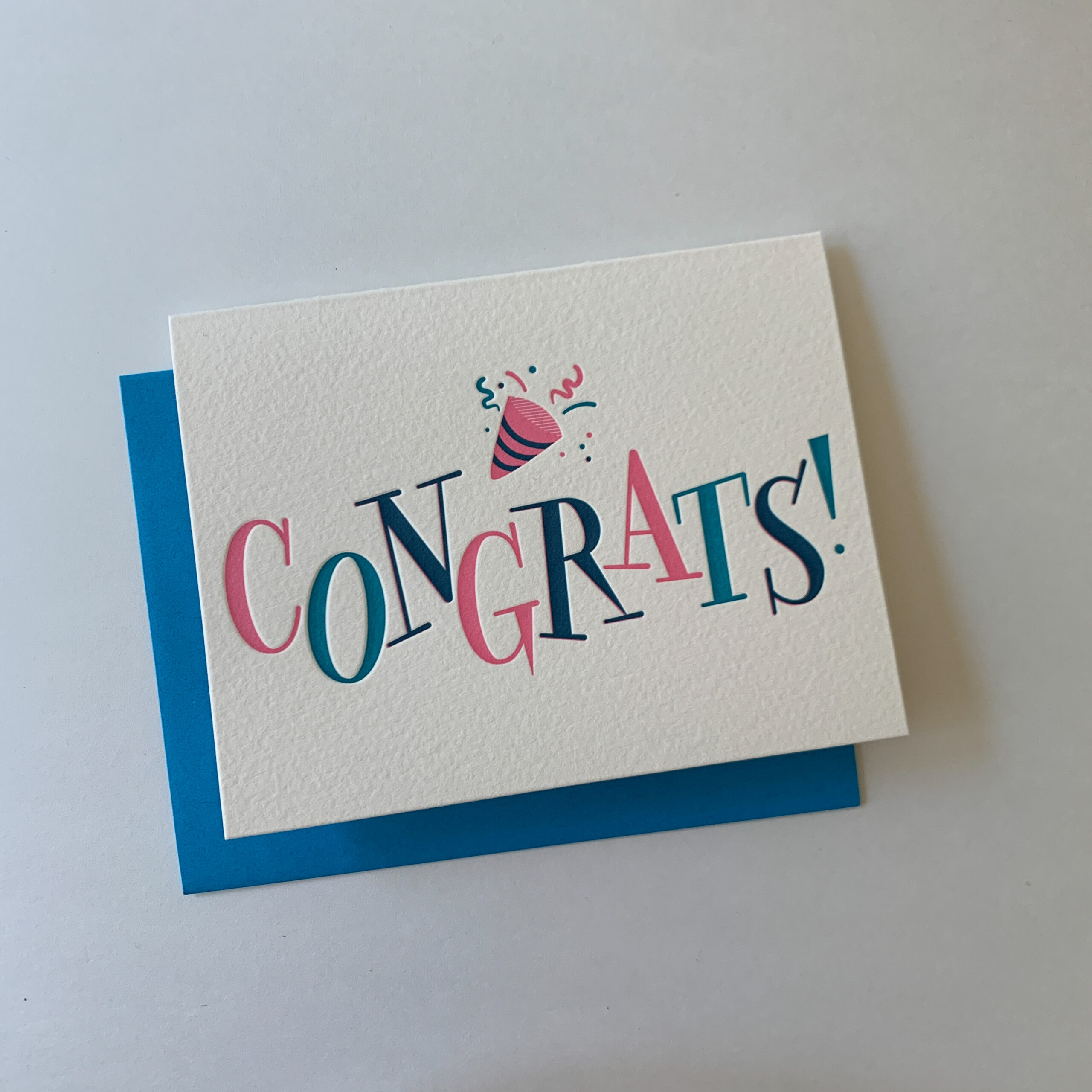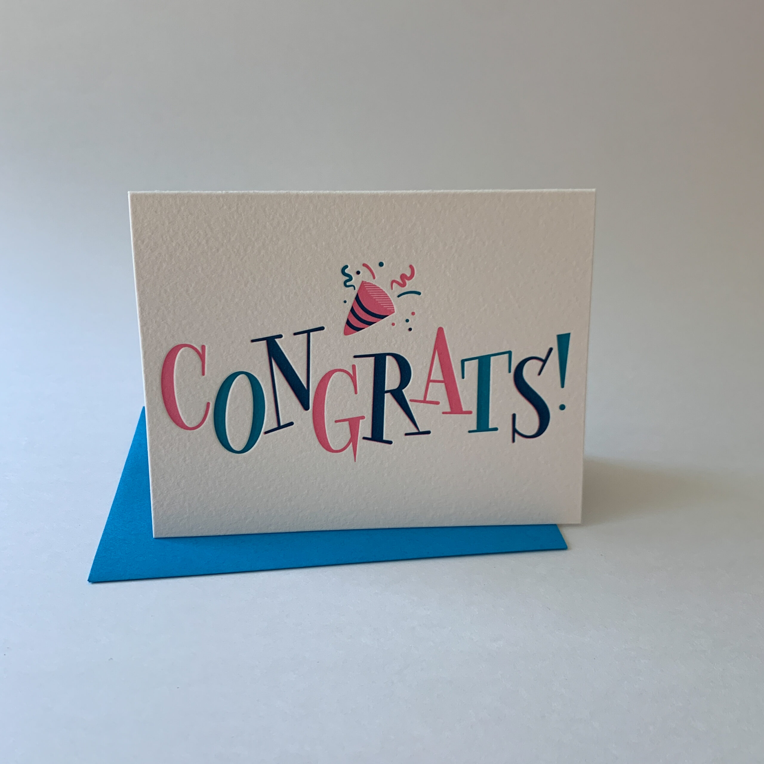 This A2 (4.25″x5.5″) “Congrats” card features a funky script, hand-printed on a historic 1948 Chandler and Price letterpress. This design utilizes a process known as overprinting, where two colors overlap another to form a third. Blank inside for your personal message, and comes with an envelope.