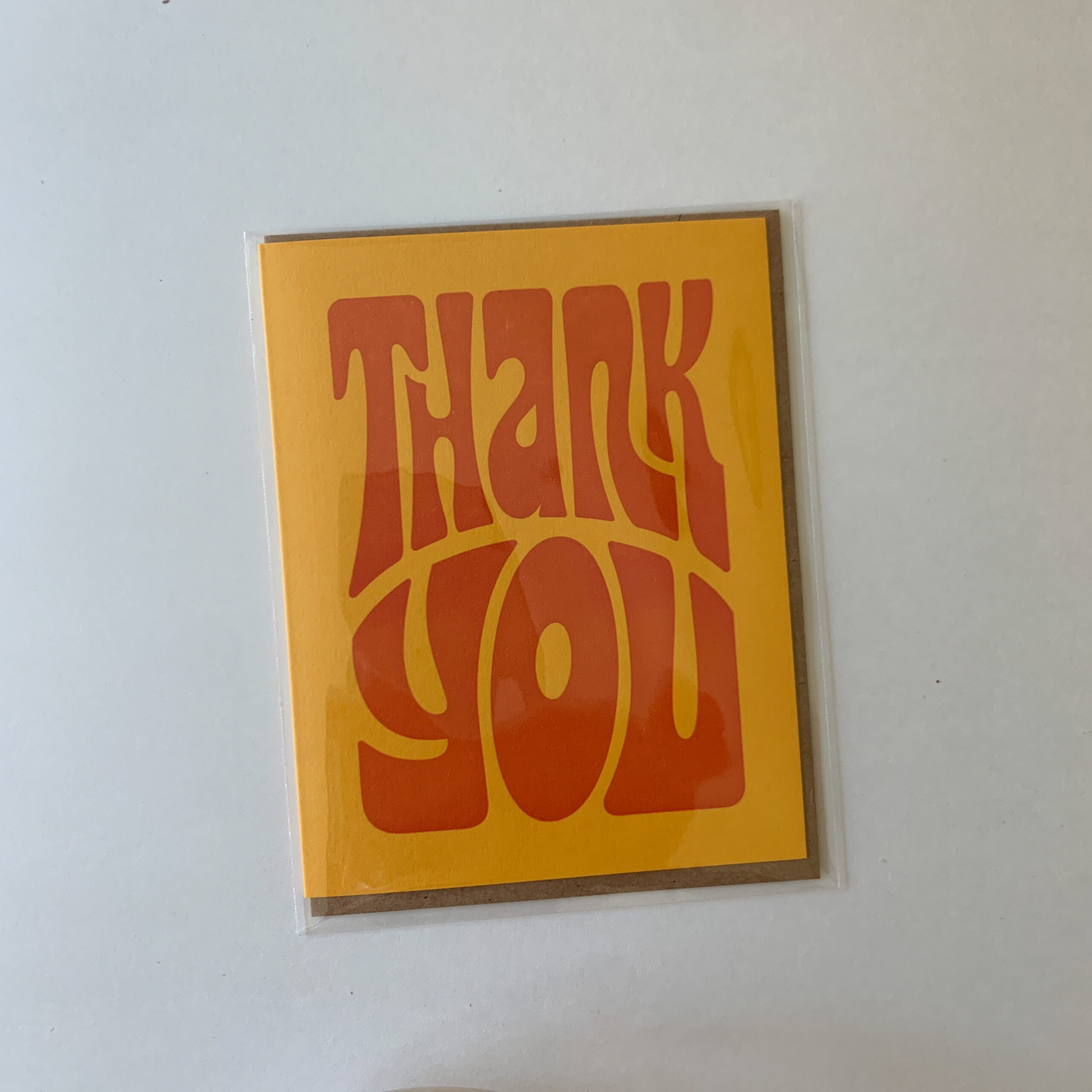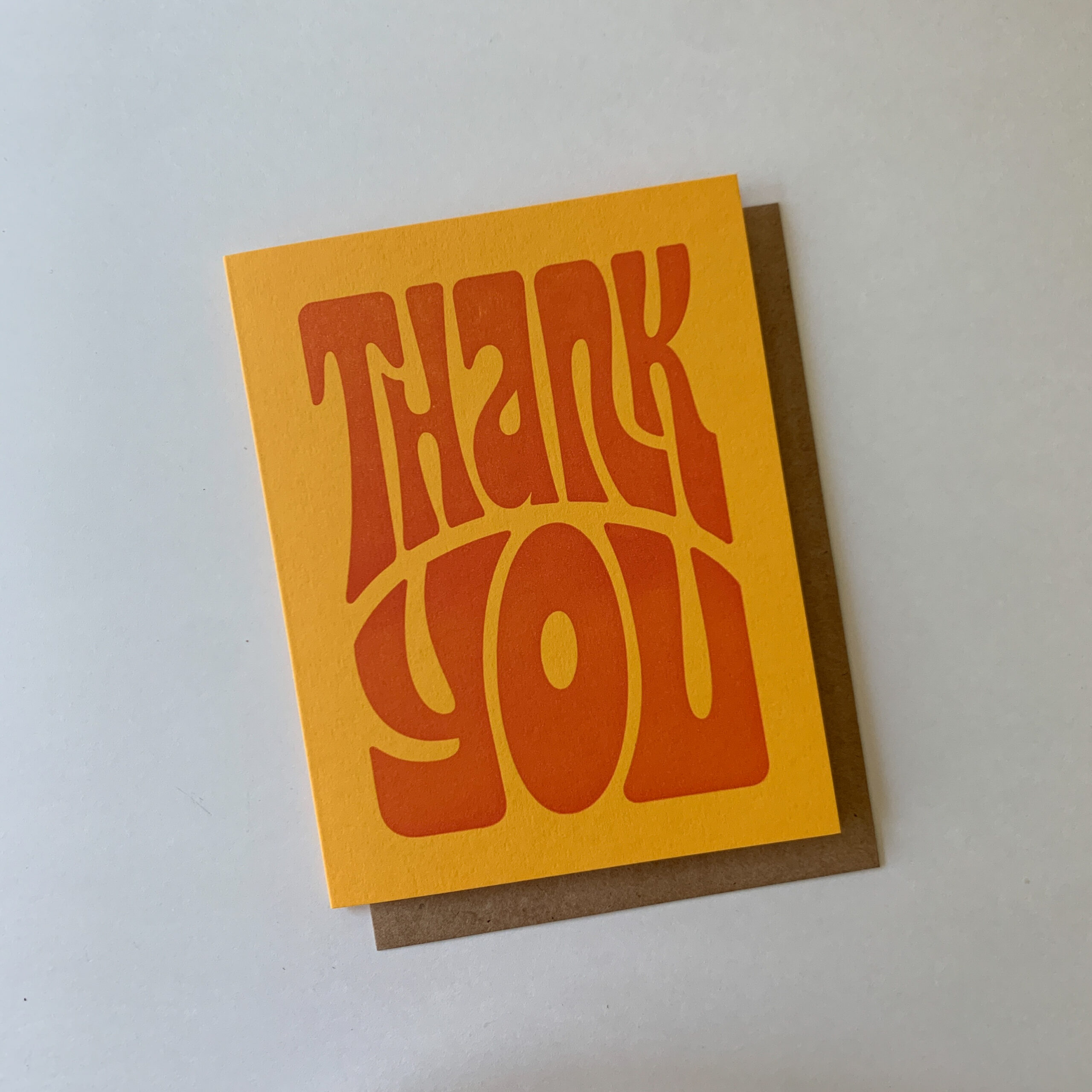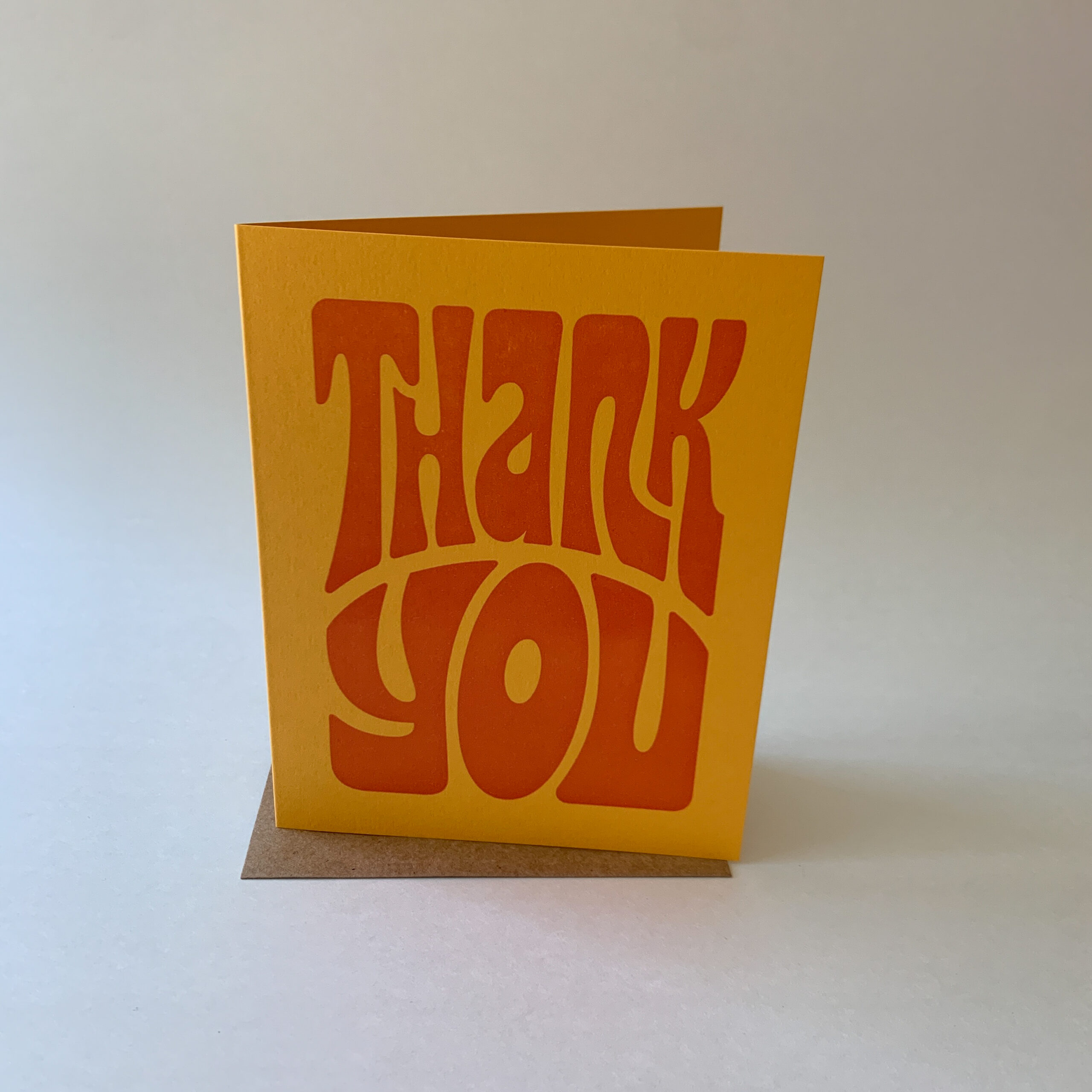 This A2 (4.25″x5.5″) “Thank You” card features groovy hand lettering printed on a historic 1948 Chandler and Price letterpress. Blank inside for your personal message, and comes with an envelope.